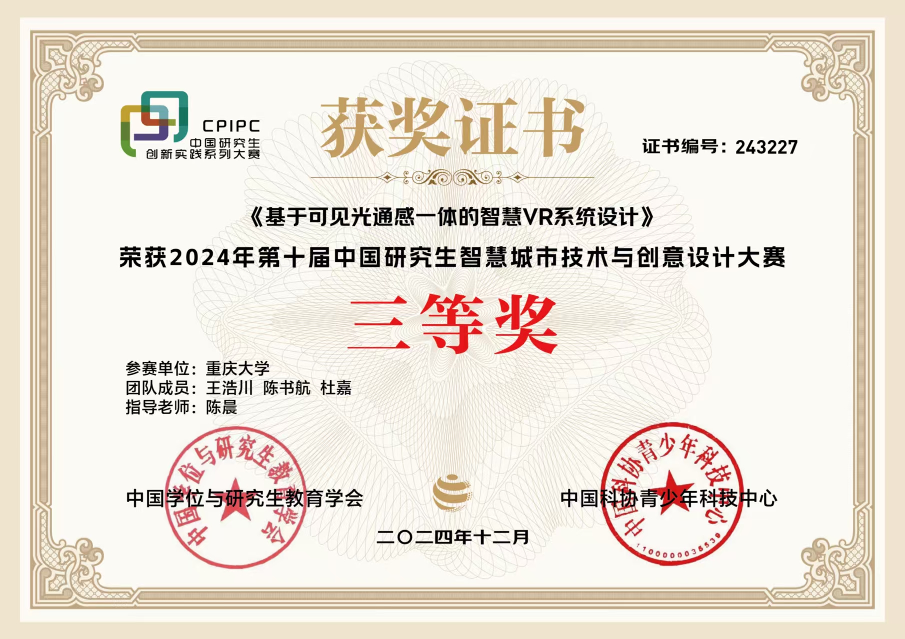 - 第十届中国研究生智慧城市技术与创意设计大赛全国三等奖(指导老师)[证书]